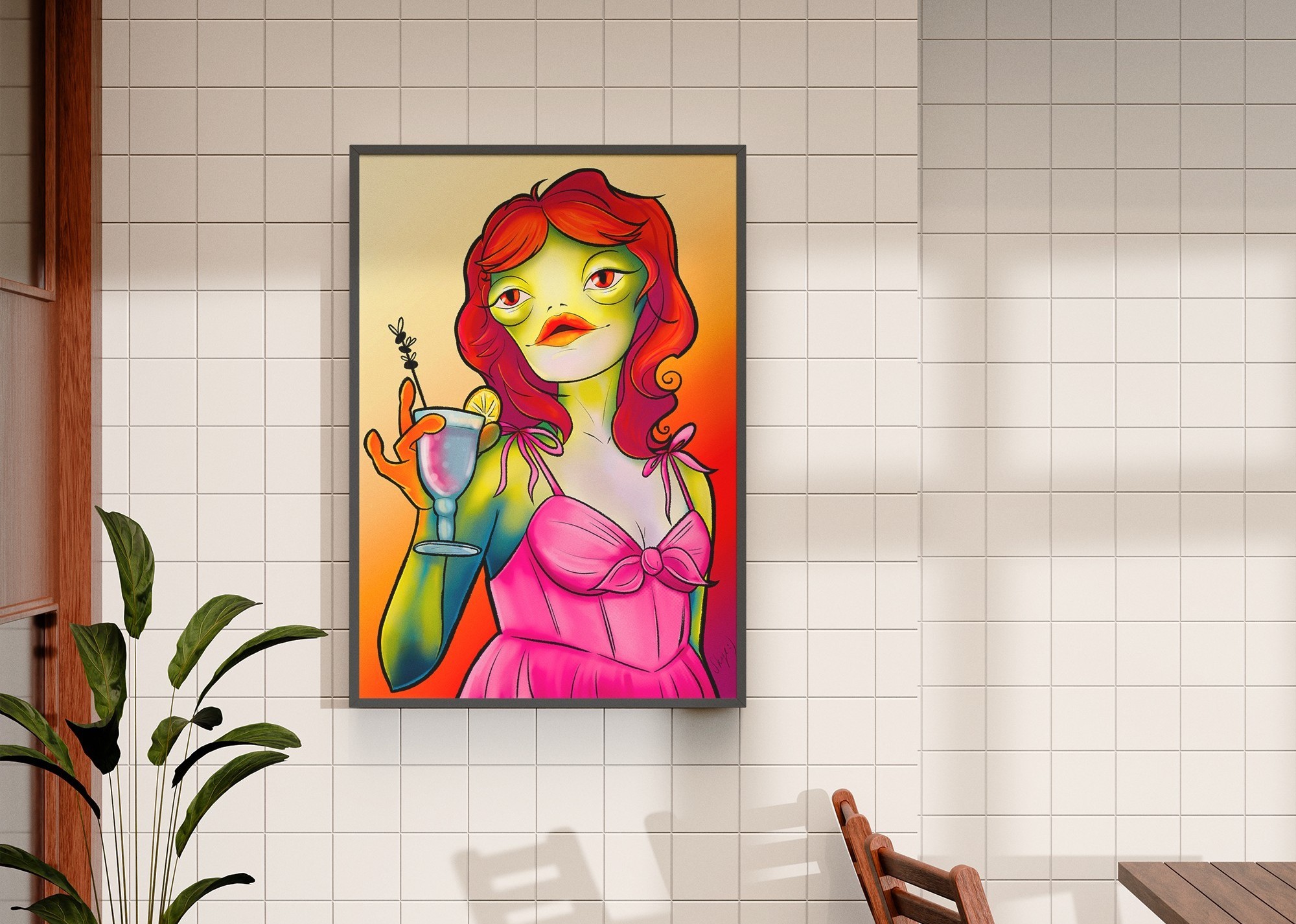 Gertrude is a vibrant character illustration blending 1950s glamour with amphibian charm. This piece explores playful hybrid design, bold colour work, and stylised rendering to create a striking, personality-driven portrait.